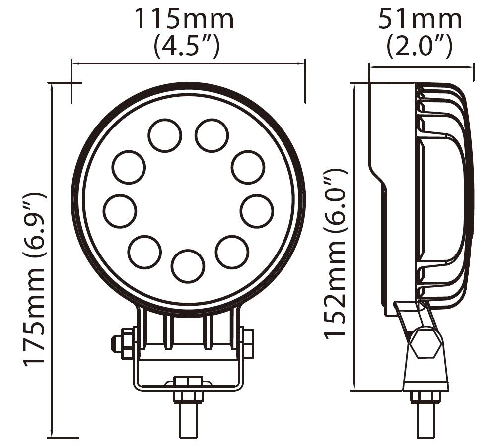 W1104500: 4" RND, LED worklight, PC lens, stainless steel mounting bracket, 1700 lm, one foot cable wire with open end. 12V-24VDC